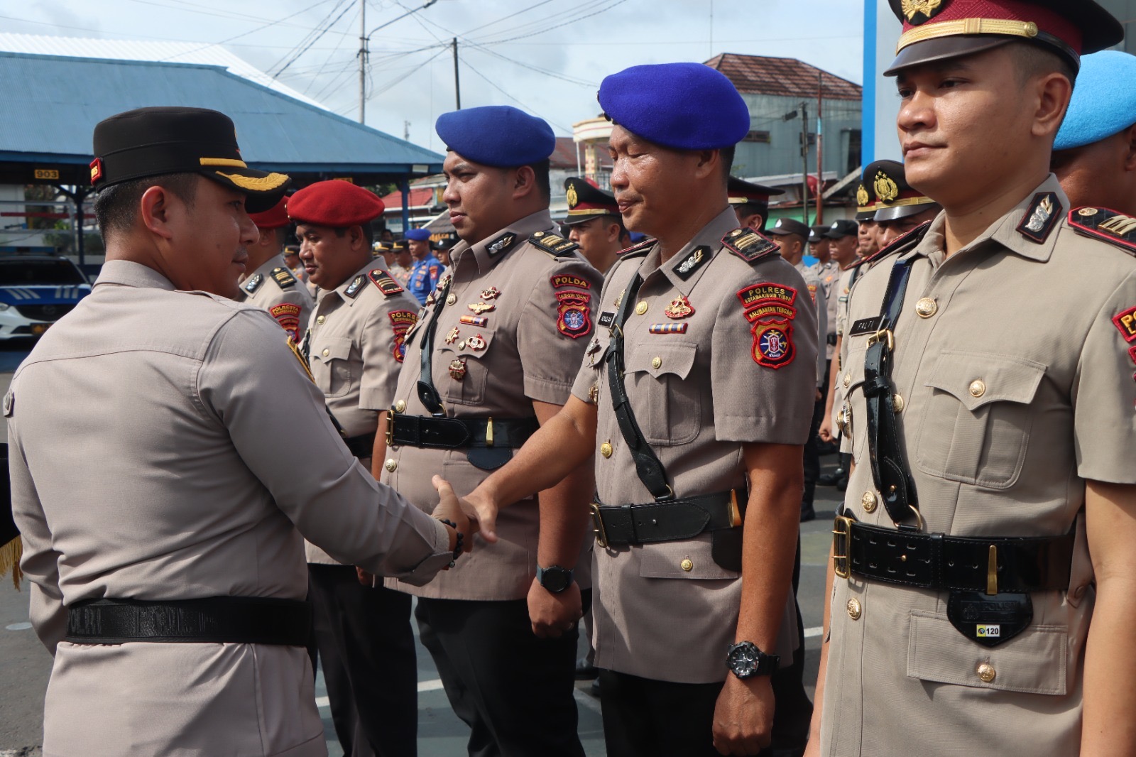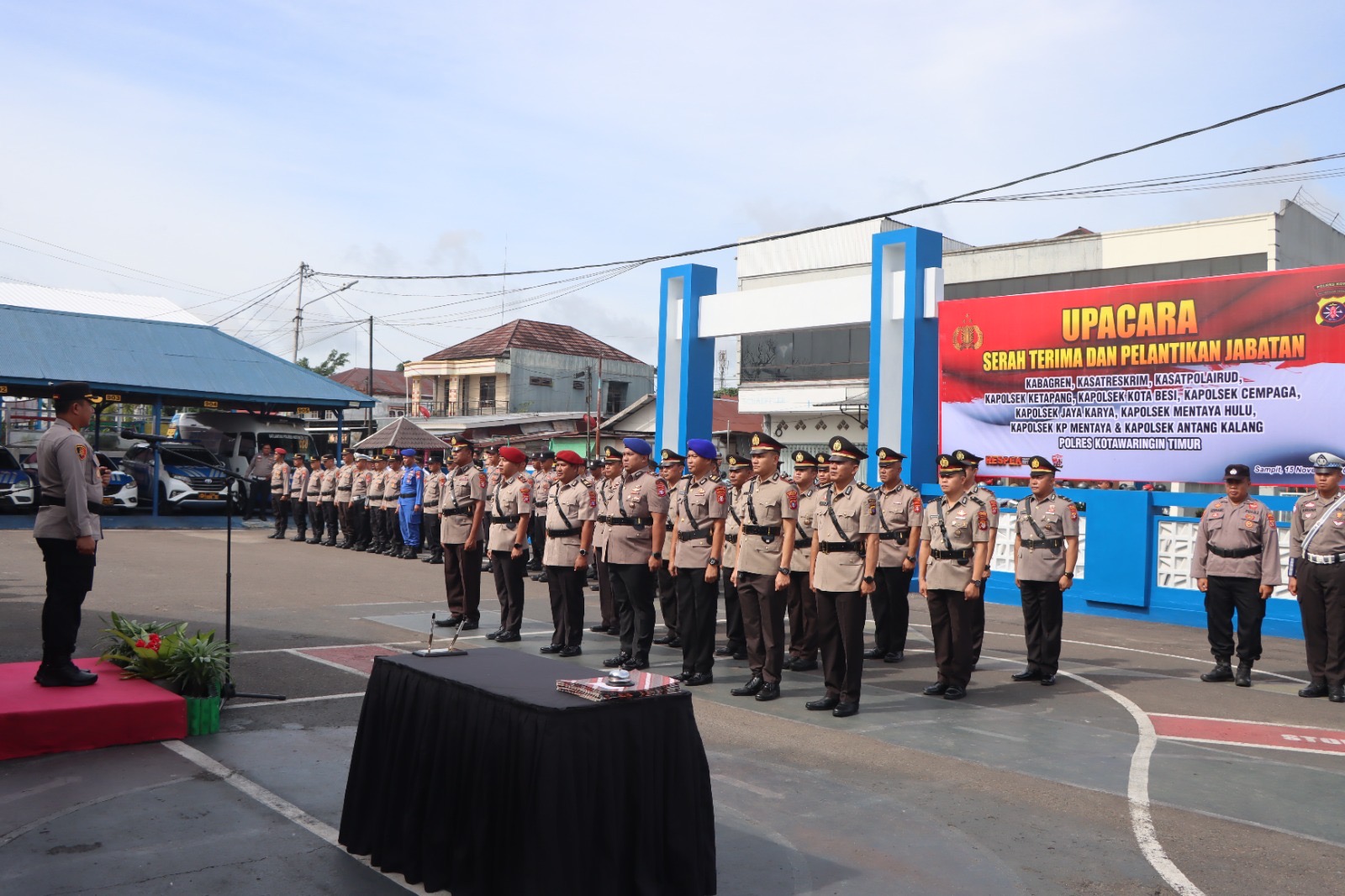 Sampit, SAMPITTV.COM – Kapolres Kotim AKBP Resky Maulana Zulkarnain, S.H., S.I.K., M.H. memimpin upacara serah terima dan pelantikan jabatan KabagRen diserahkan kepada AKP Bambang Budi Rahayu, Kasat Reskrim dari AKP Iyudi Hartanto, S.T.K,S.I.K. diserahkan kepada AKP Sugiharso, S.H., Kasat Polairud dari AKP Rizky Hidayah Harahap,S.trk.SIK.diserahkan kepada AKP Roni Paslah, S.H., Kapolsek Ketapang dari AKP Eka Palti Arie Hutagaol,S.I.K. diserahkan kepada AKP Anis, Kapolsek Kota Besi dari AKP Rochman Hakim,S.H. diserahkan kepada IPDA Noor Ikhsan, S.Sos., Kapolsek Cempaga dari AKP Moh Rochim, S.Sos. diserahkan kepada AKP Hieronymus Tri Diantoro. S.H., Kapolsek Jaya Karya dari IPTU Subronto, S H. diserahkan kepada IPDA Fauzi Alamsyah S.H., Kapolsek Mentaya Hulu dari IPDA Noorikhsan S.Sos diserahkan Kepda IPDA Singgih Teguh Prasetiyo,S.E. Kapolsek KPM IPDA Agus Setiawan, S.H. diserahkan Kepada Ipda Ahmad Zainal dan Kapolsek Antang Kalang dari IPDA Jonika S.Sos. diserahkan kepada IPDA Budi Hartono, S.H. bertempat di halaman kantor Sat Lantas Polres Kotim, yang dihadiri oleh para PJU dan seluruh personel Polres dan Polsek dalam kota. Upacara ini merupakan bagian dari proses pengembangan karir dan peningkatan kualitas personel Polres Kotim, pada hari Sabtu pagi (15/11/2025).