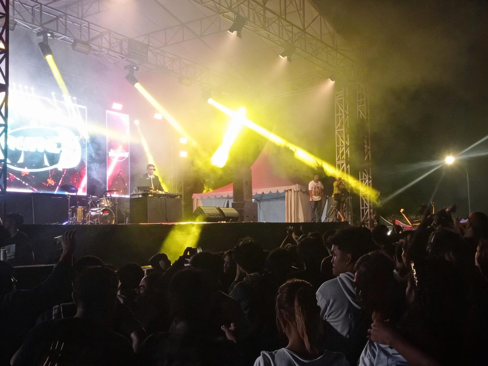 Panggung yang telah disiapkan tampak megah dengan peralatan sound system dan pencahayaan yang memadai, menambah kesan profesional dan memanjakan mata serta telinga para penikmat musik. Meskipun cuaca tampak agak lembap dan area sekitar terlihat basah, hal tersebut tidak menyurutkan semangat warga untuk hadir dan ikut memeriahkan acara.