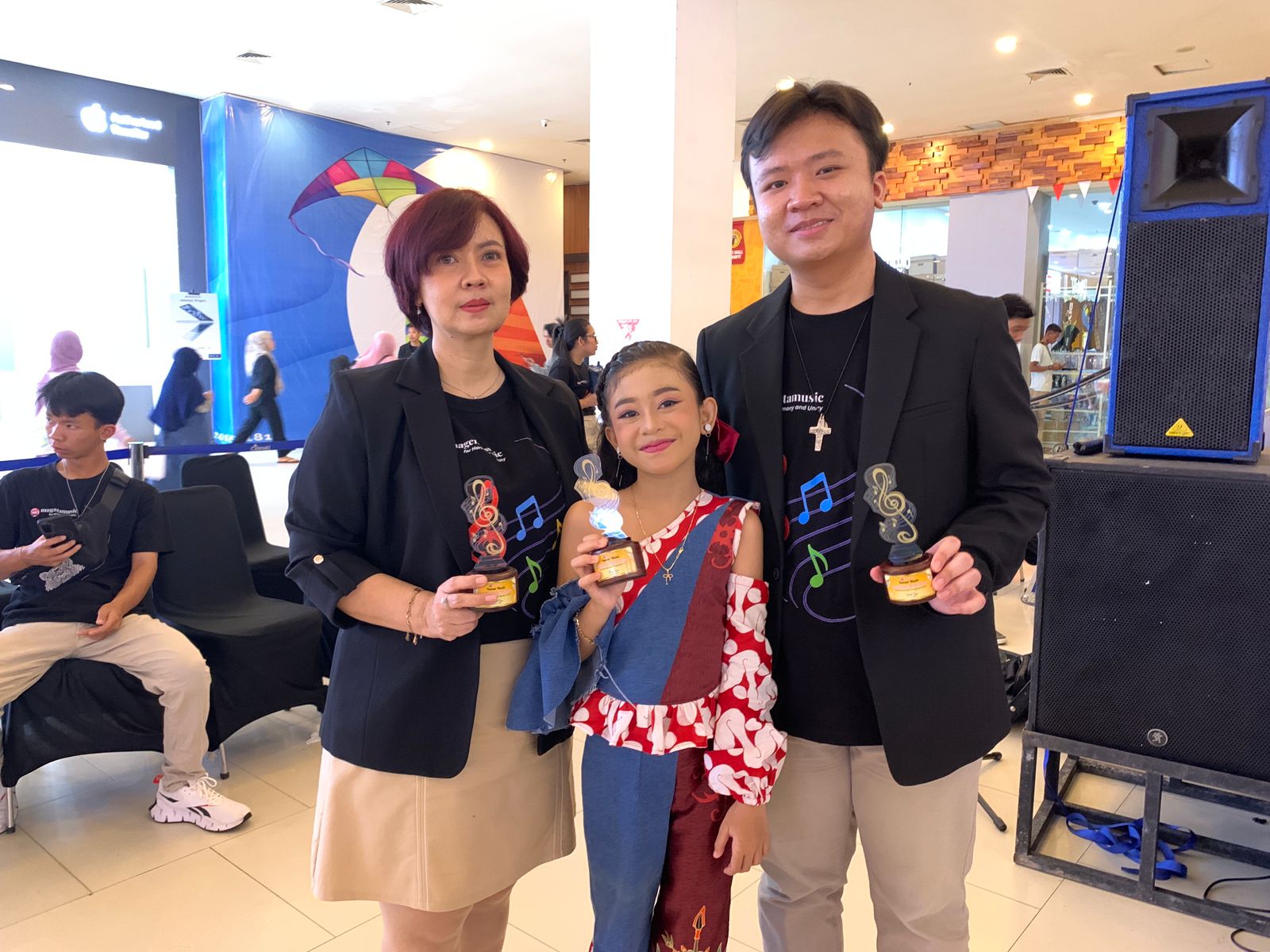 Foto :Founder, Owner Magenta Music : Mr. Roland,Founder Hesti Kawai Music Sampit : Ms. Hesti, Bersama salah satu peserta Symphony Kemerdekaan Dzakia Arraudah Khumairah Akhmad,Minggu 10 Agustus 2025 Hall Citimall Sampit Kotawaringin Timur